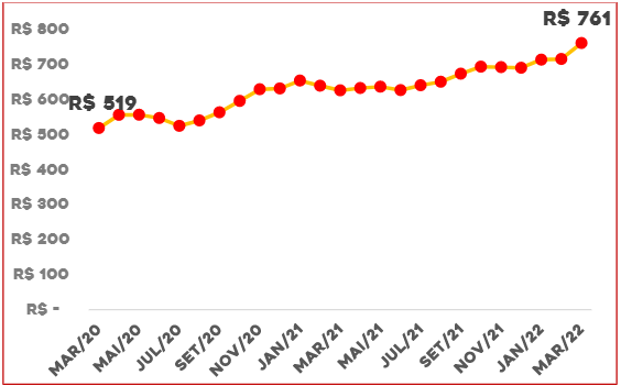 A queda no poder de compra dos trabalhadores é agravada porque os preços dos produtos da cesta básica subiram ainda mais do que a inflação geral. Desde o começo da pandemia, o custo do conjunto de alimentos básicos teve acréscimo de R$ 243 em São Paulo, aumento de 47% entre março de 2020 e março de 2022.