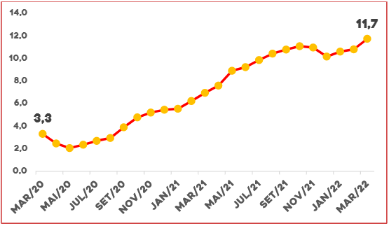 Desde meados de 2020, a inflação sobe mês a mês, quase ininterruptamente. Em março de 2022, o INPC-IBGE (Índice Nacional de Preços ao Consumidor, do Instituto Brasileiro de Geografia e Estatística) chegou a quase 12% ao ano.