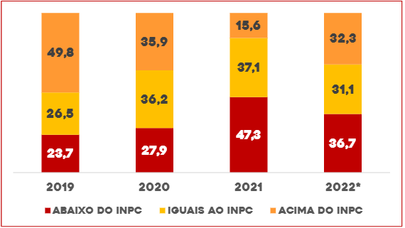 Como resultado, a quantidade de reajustes abaixo da inflação cresceu de 23,7%, em 2019, para 47,3%, em 2021. No último ano, apenas 15,6% alcançaram ganhos reais.
