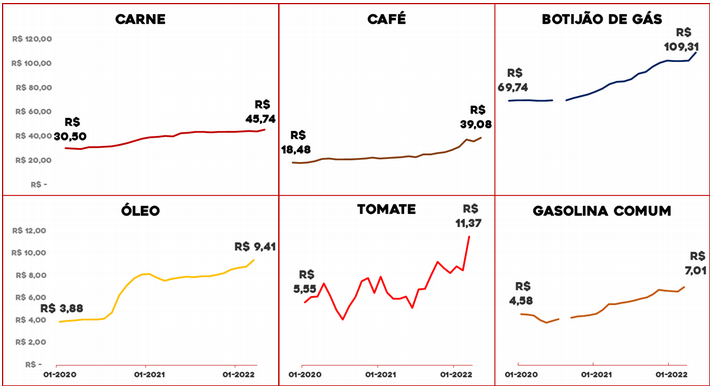 Produtos básicos como óleo, café e tomate mais do que dobraram de preço entre 2020 e 2022. O preço médio de um botijão de gás, que era de R$ 70 no início de 2020, subiu para R$ 109 em março de 2022, alta de 57% em dois anos. Essa elevação tem obrigado muitos brasileiros a procurarem combustíveis alternativos e, muitas vezes, perigosos, como lenha e álcool. O alto preço da carne também levou a uma mudança nos pratos dos brasileiros. Em 2021, o consumo de carne no Brasil foi o menor dos últimos 25 anos.