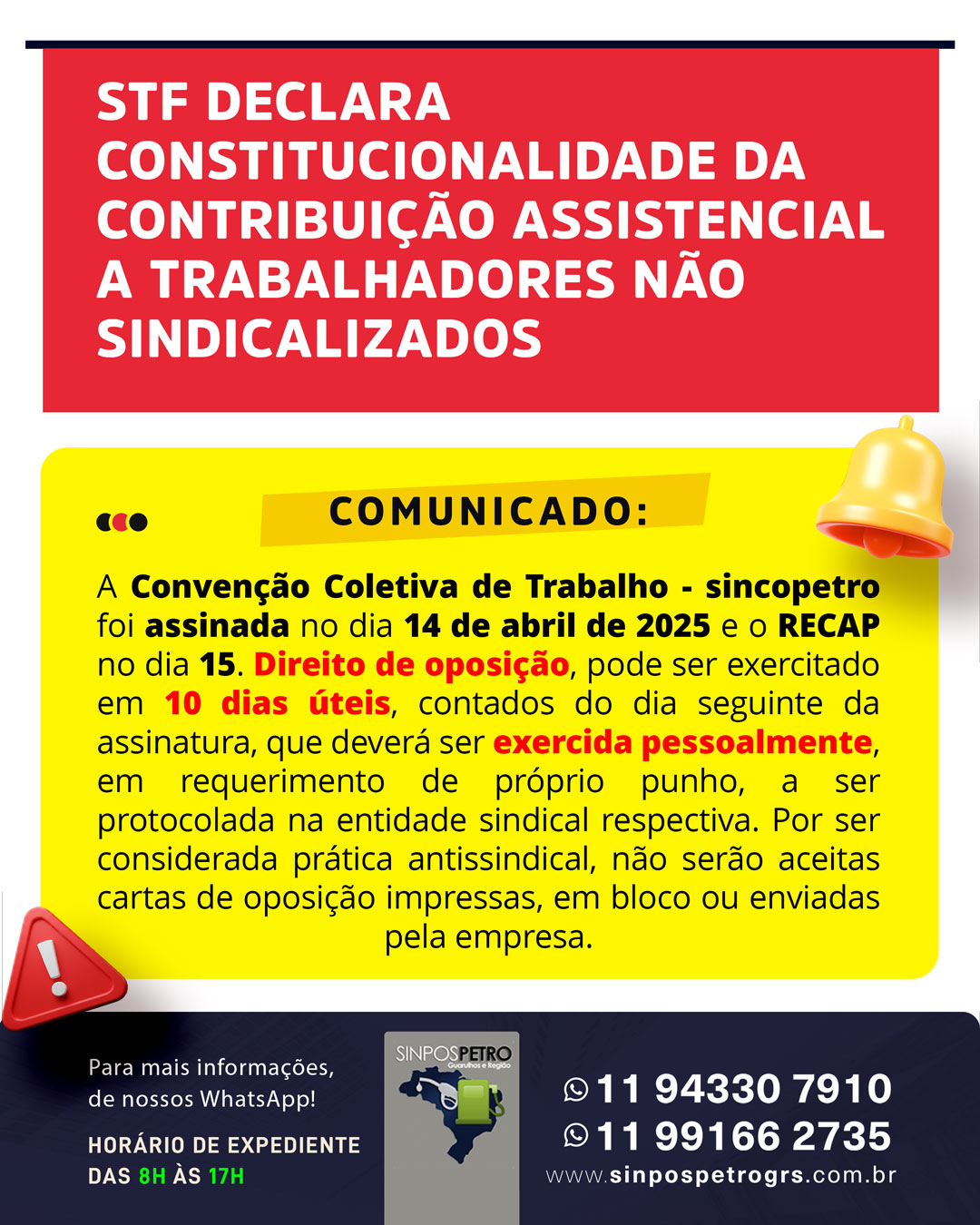 📣🔔COMUNICADO: A Convenção Coletiva de Trabalho - sincopetro foi assinada no dia 14 de abril de 2025 e o RECAP no dia 15. Direito de oposição, pode ser exercitado em 10 dias úteis, contados do dia seguinte da assinatura, que deverá ser exercida pessoalmente, em requerimento de próprio punho, a ser protocolada na entidade sindical respectiva. Por ser considerada prática antissindical, não serão aceitas cartas de oposição impressas, em bloco ou enviadas pela empresa.