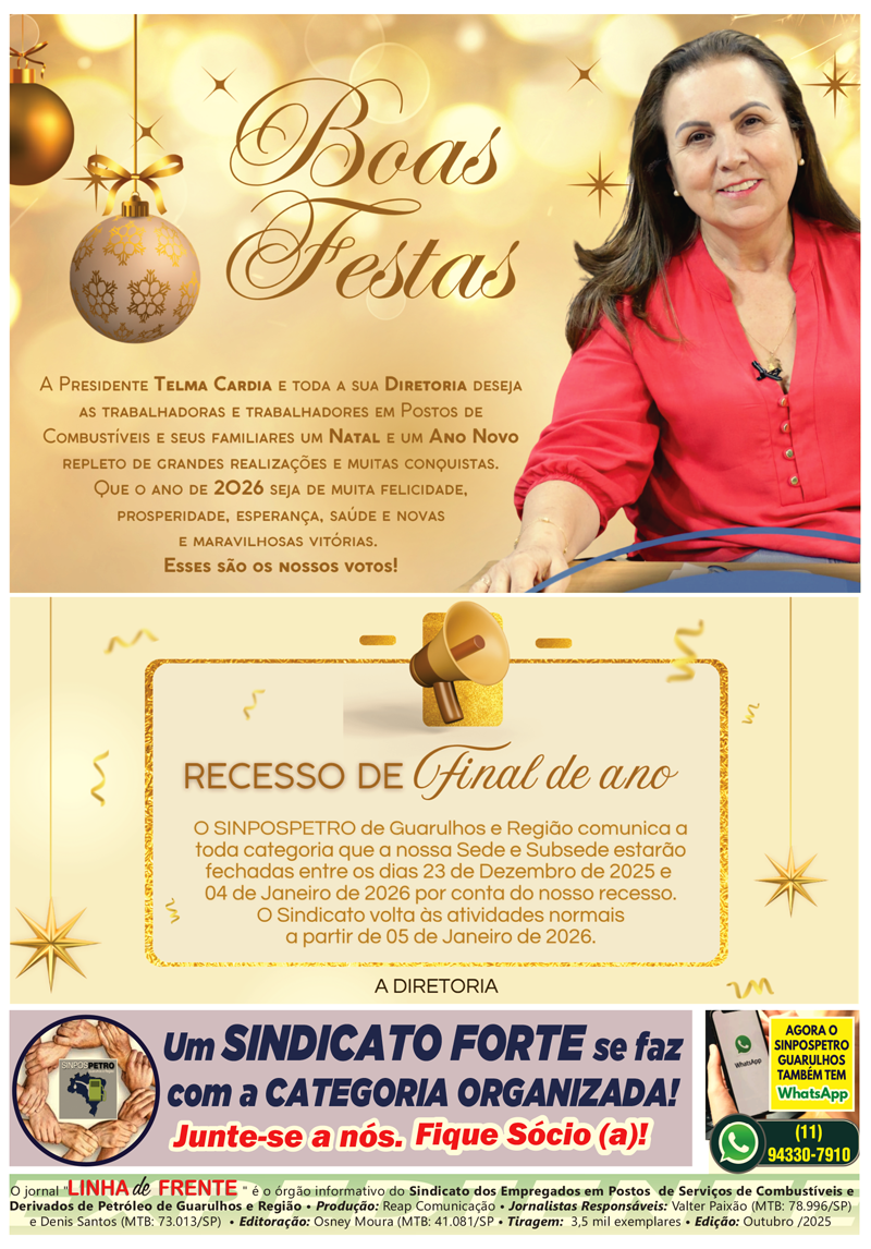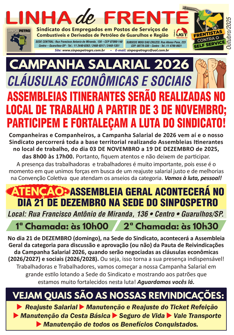 Companheiras e companheiros: nosso sindicato vai percorrer a base com assembleias itinerantes de 03/11 a 19/12 — no local de trabalho. A Assembleia Geral será 21/12 na sede do SINPOSPETRO (Rua Francisco Antônio de Miranda, 136 — Centro, Guarulhos/SP).