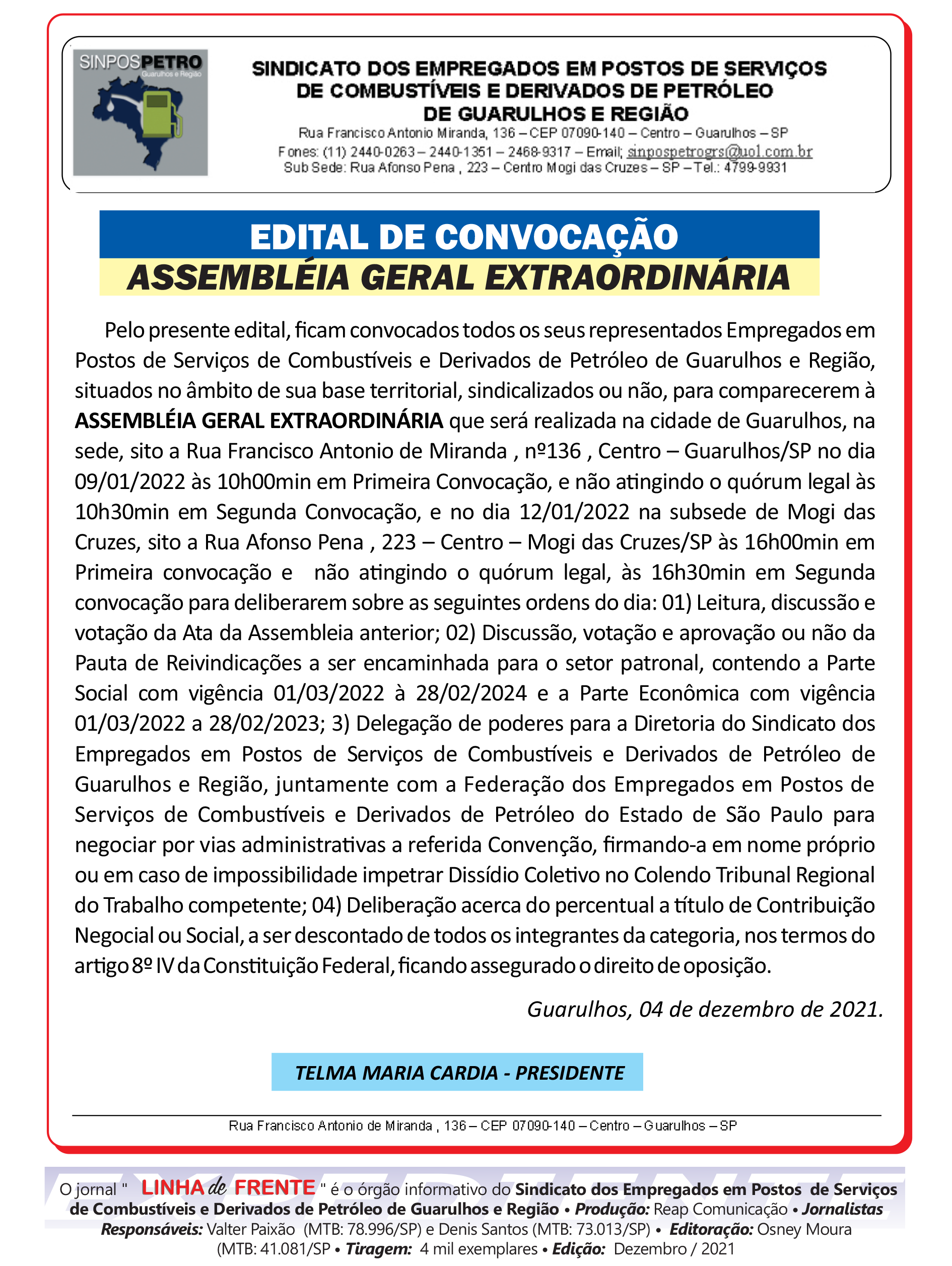 Dia 09 de Janeiro (Domingo): SEDE GUARULHOS: Rua Francisco Antonio de Miranda, 136 - Centro